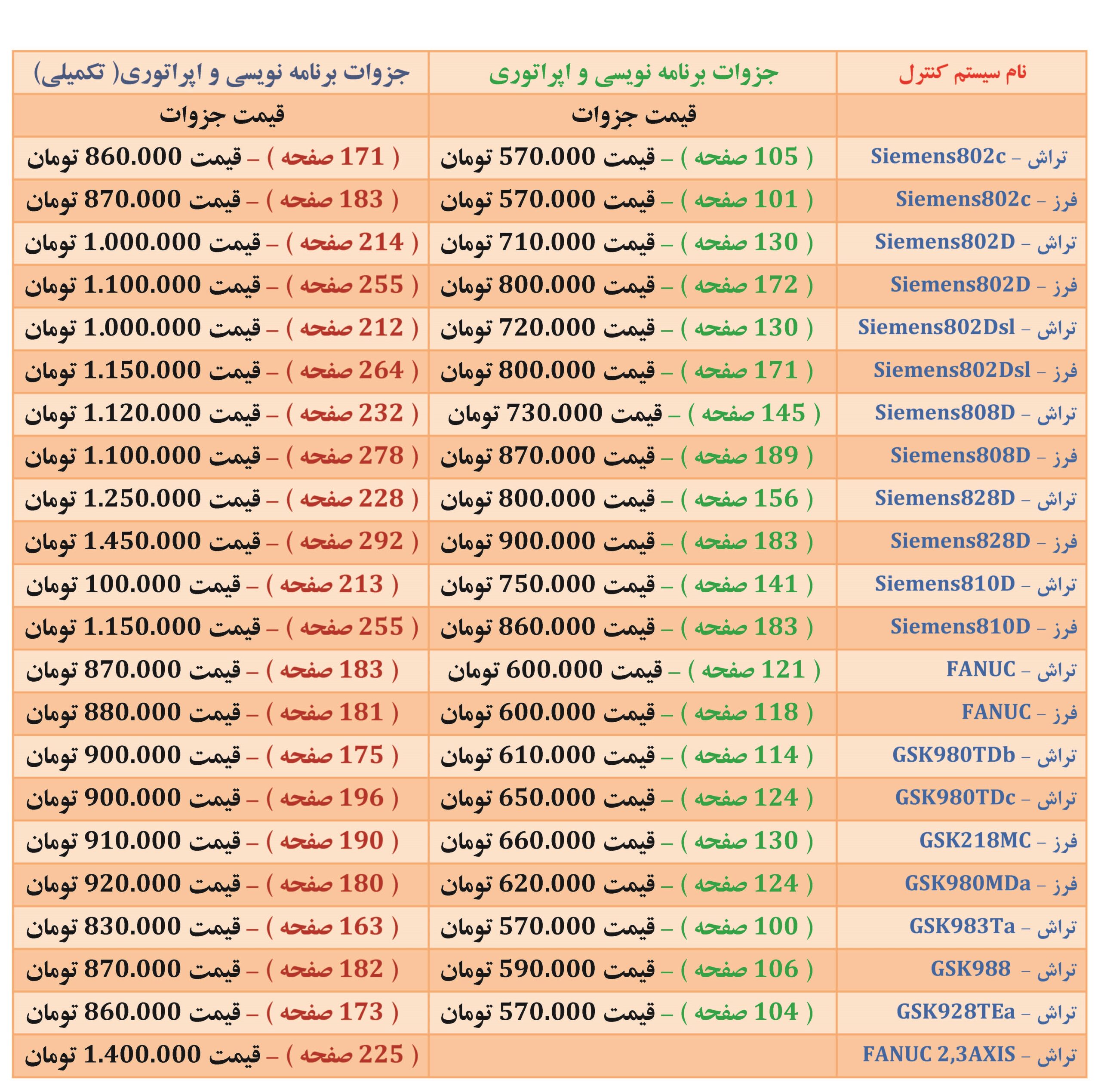 اولین و کامل ترین جزوات آموزش اپراتوری و برنامه نویسی در ایران که می توانید ماشین CNC که با این سیستم کنترل ها کار می کنند را به طور کامل راه اندازی کنید این جزوه ها تنها منبع اموزشی هستند که می توانید یک سیستم کنترل را به صورت عملی و کاربردی ( برنامه نویسی و اپراتوری) به اجرا در آورید و هزینه ایکه برای خرید آنها می پردازید خیلی کمتر از آن است که بخواهید در کارگاه خود یا در کلاس های اموزشی پرداخت کنید.